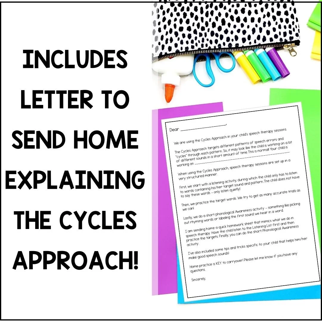 Take the guesswork out of implementing the Cycles Approach for Phonology. These simple, engaging Cycles Approach homework sheets include ALL PRIMARY PATTERNS (gliding, fronting & backing, initial consonant deletion, final consonant deletion, S clusters, and syllableness) to send home as homework when using the Cycles Approach! These no prep speech therapy activities are designed to be fast and easy for caregivers to use at home! Because let's be real...homework shouldn't take long!